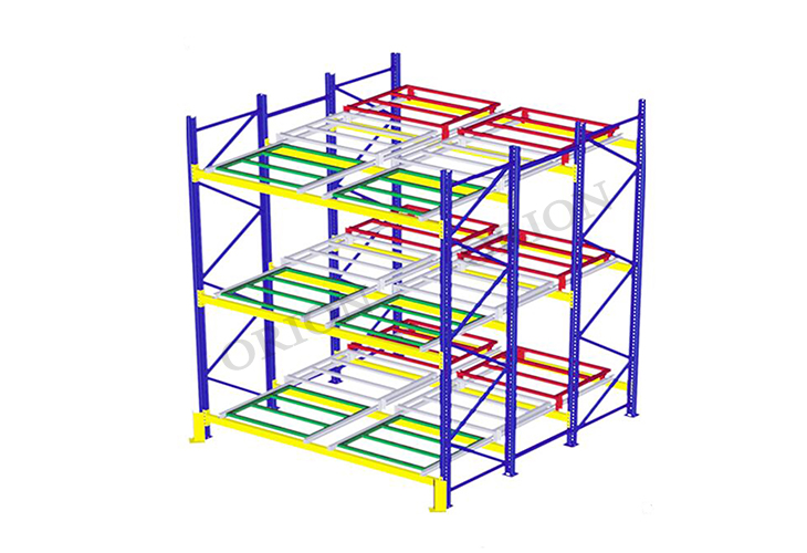 The main structure is similar to the pallet rack, but a special sliding trolley is installed on the beam. The pallet are placed on the trolley, which can slide smoothly on the track. The track usually has a certain slope so that the cargo can slide forward under gravity.